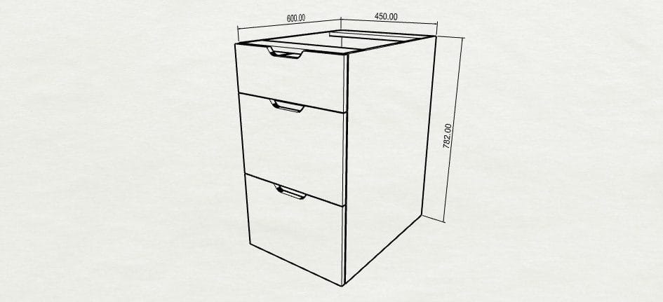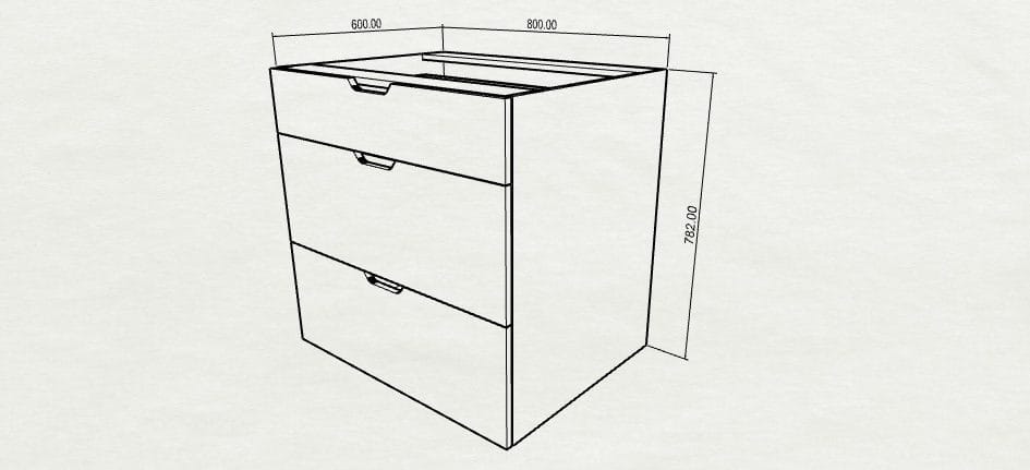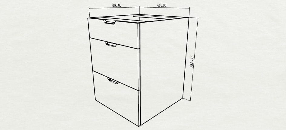 The top drawer front H is 166, the other two the same H, side-mounted and non-soft closing full extension drawer runners