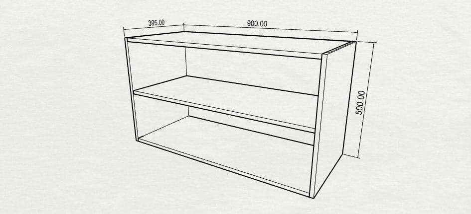 wall mounted corner open shelf cabinet D395 x H500 x W900/900 (one fixed shelf in the middle)